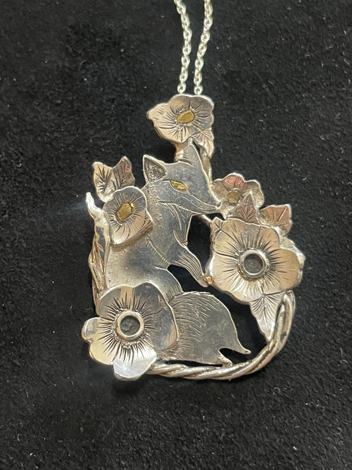 Floral Respite- Argentium Silver Fox Sculpture Pendant With Gold Inlay